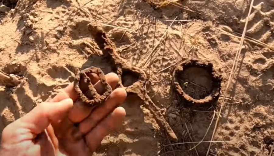Seine Funde können sich durchaus sehen lassen. Artur macht in dem kurzen Zeitraum, in welchem wir die Grabumg begleiten, gleich eine ganze Reihe spektakulärer Funde. So detektiert er dort ein weiteres Bauernwehr, doch dieses Mal nicht als Grabbeigabe sondern frei im Feld, gleich daneben findet er die Reste des Gürtels eines Armbrustschützen, er findet den Ring, die Spannhilfe und die Schnalle, der bisher einzige Fund dieser Art in Alt Wartenburg. Daneben ein paar Breakete des Deutschen Ritterordens, mehrereArmbrustbolzen und Heiligenanhänger. Unter den diesjährigen Funden befindet sich auch der Knauf eines Schwertes, also das Ende des Griffs,der das Gegengewicht zur Klinge bildet. Dieser wurde allerdings durch eine klassische Grabung in einem der Keller gefunden.