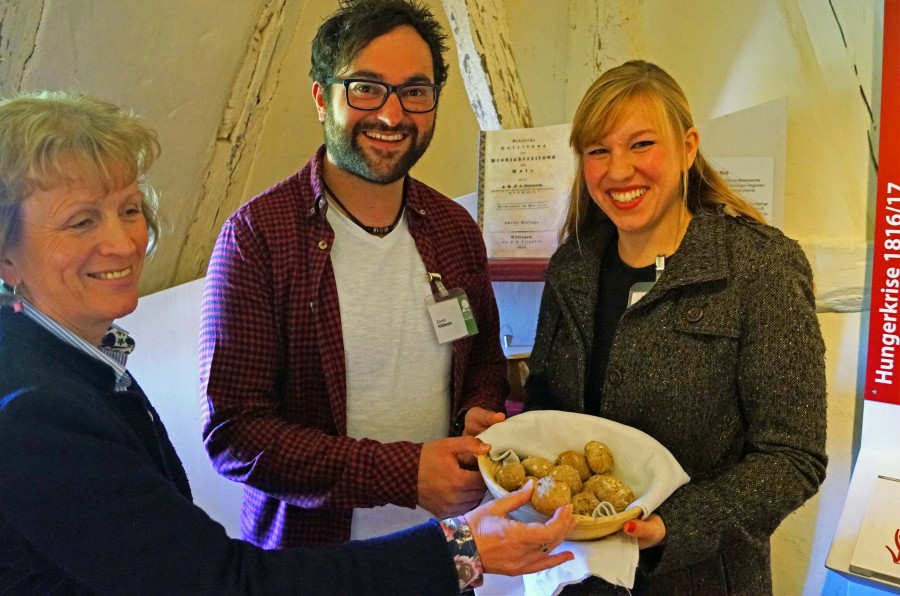 Beuren (kry) - Die Museumsleiterin, Steffi Cornelius, stellt die beiden Schöpfer der neuen Ausstellung vor. Annika Schröpfer und Daniel Hildwein hatten sich während ihres Volontariats im Freilichtmuseum Beuren eingehend mit der Hungersnot im Jahr 1816 beschäftigt und das Thema in eine Dauerausstellung verpackt. „Damit hatten die beiden eine Punktlandung, denn die Eröffnung fällt mit ihrem letzten Arbeitstag zusammen“, berichtete Steffi Cornelius. Sie erklärte, dass das sogenannte Doster-Haus – ein Wohn-Stall-Haus aus Beuren – für das Thema „Hungerbrot und Fruchtsäule prädestiniert sei. Das Haus wurde 1980 in Beuren abgebaut und im Freilichtmuseum neu errichtet.